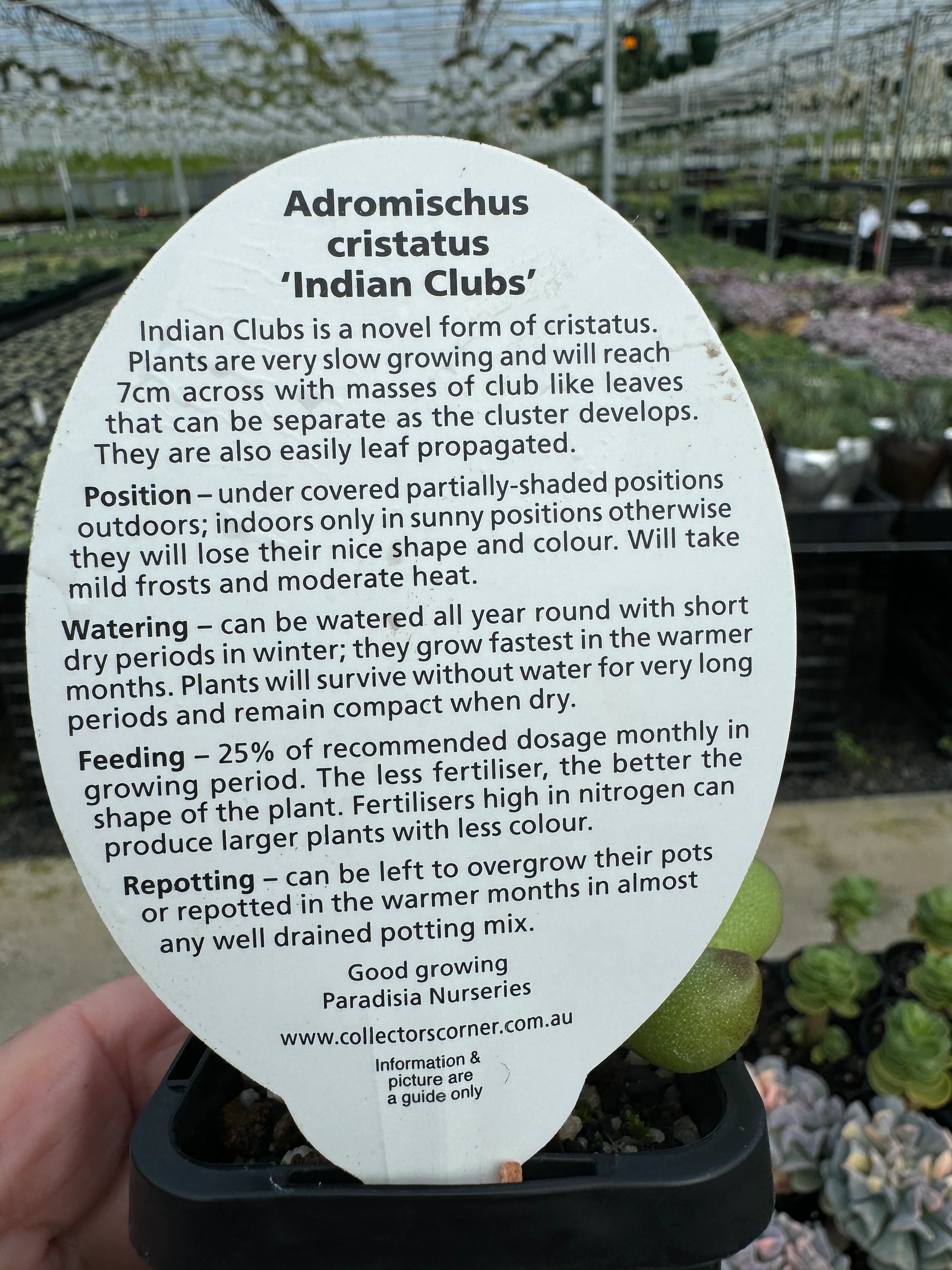 Adromischus cristatus 'Indian Clubs' is a cultivated form of the South African species Adromischus cristatus, native to the Eastern Cape where it grows on rocky slopes. This selection develops clusters of upright stems with thick, club-shaped leaves that narrow at the base and broaden towards the tip, often with slightly crimped or wavy margins. The surface is covered with a fine bloom, giving a grey-green tone to the foliage. Mature plants can produce slender flower spikes topped with small tubular flowers that are greenish-white with purplish tips, though the unusual club-shaped leaves are its main ornamental feature.