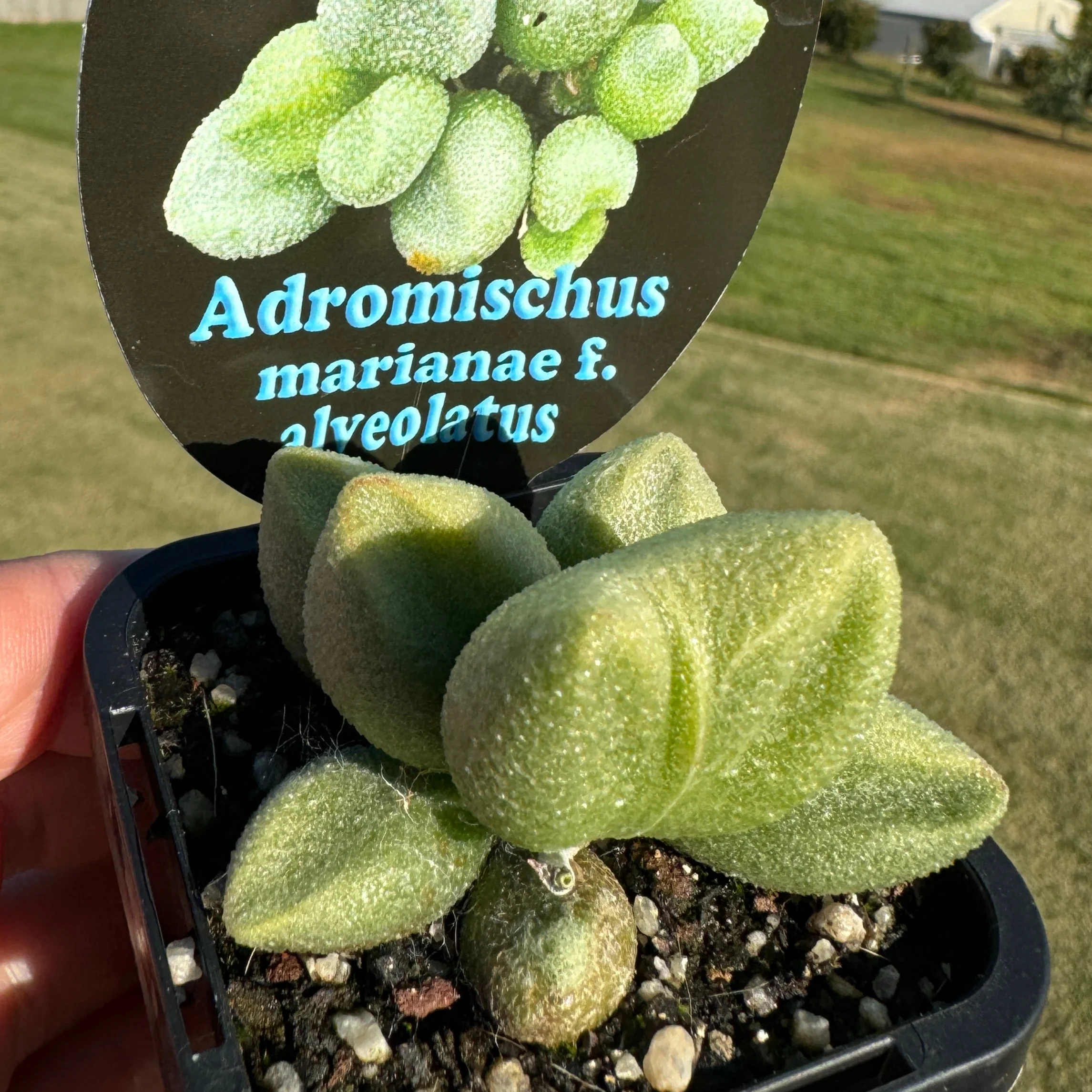 Adromischus marianiae f. alveolatus is a recognised form of Adromischus marianiae, distributed in arid regions of Namibia and South Africa where it grows among rocks and gravel in mineral-rich soils. This form is characterised by its thick, irregular leaves with a distinct alveolate surface, meaning the texture is pitted or honeycombed. Leaf colouration varies from grey-green to brownish-red depending on sun exposure and seasonal stress. In cultivation, the plant remains compact and clumping. Mature plants may produce slender flower stalks with small, tubular flowers that are pale green to whitish with purple tips, although the foliage is the most ornamental feature.