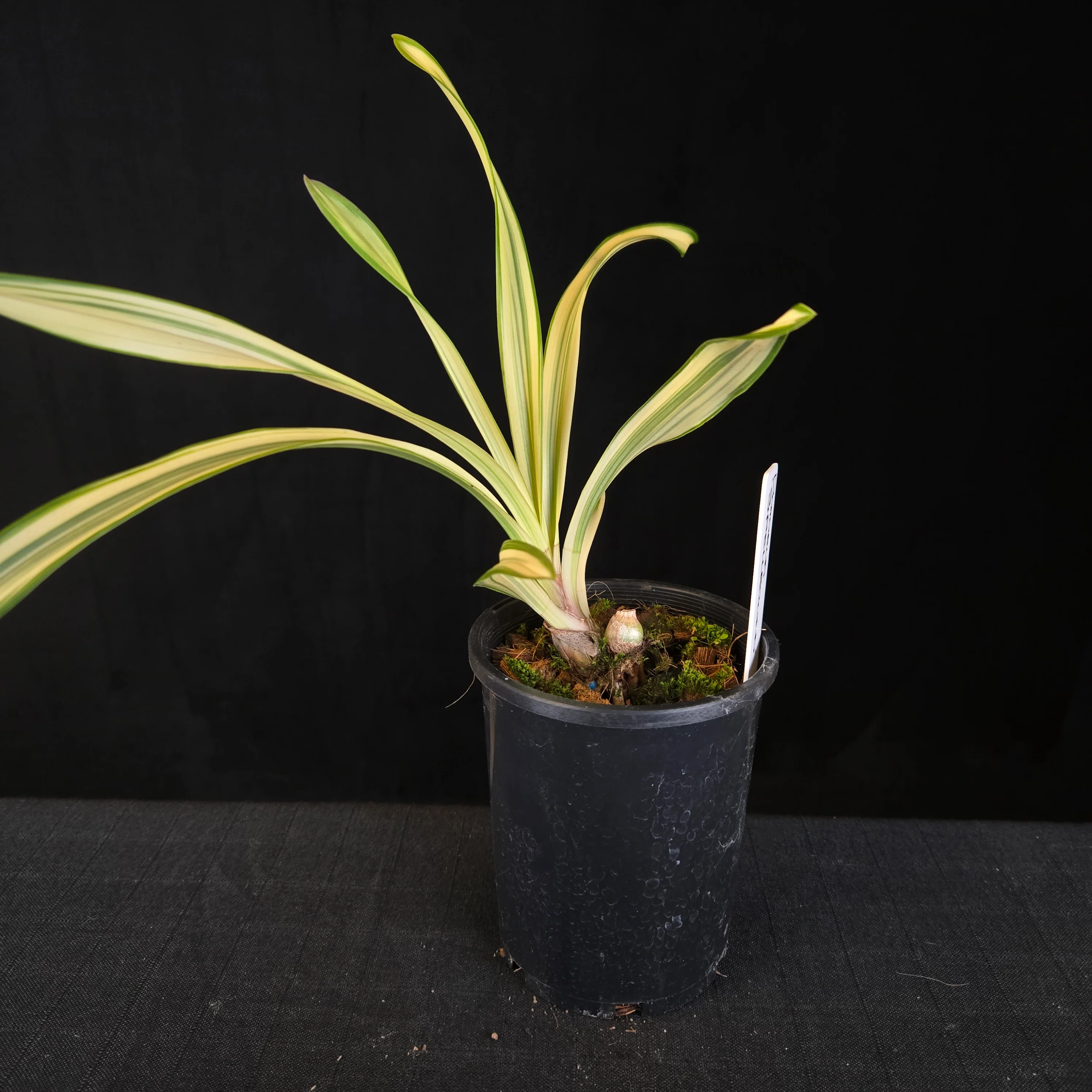 Cymbidium Rotorua 'Spell Bound' is a terrestrial hybrid orchid admired for its robust flowering performance and, in this special form, for a truly rare genetic trait—stable foliar variegation. Unlike most Cymbidiums, this variegated version cannot be mericloned, meaning each plant must be propagated through careful division. As such, these specimens are extraordinarily scarce.