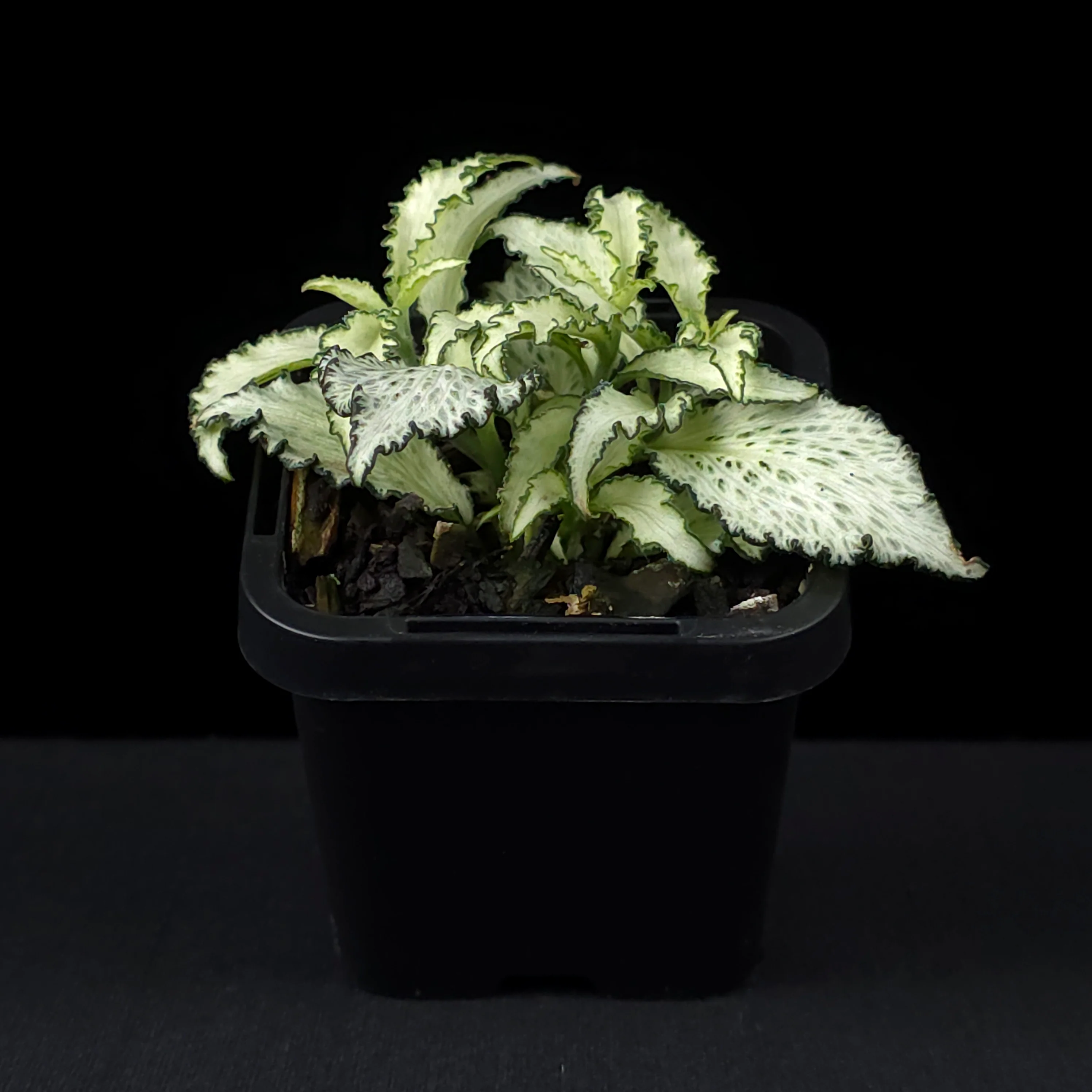 Fittonia 'Paradisian Star' is a distinctive cultivar with narrow, jagged leaves marked in silvery white and edged with fine green margins. The foliage has a textured appearance from the ruffled edges, giving it a spiky outline uncommon among Fittonias, while the bright centres lend a luminous quality.