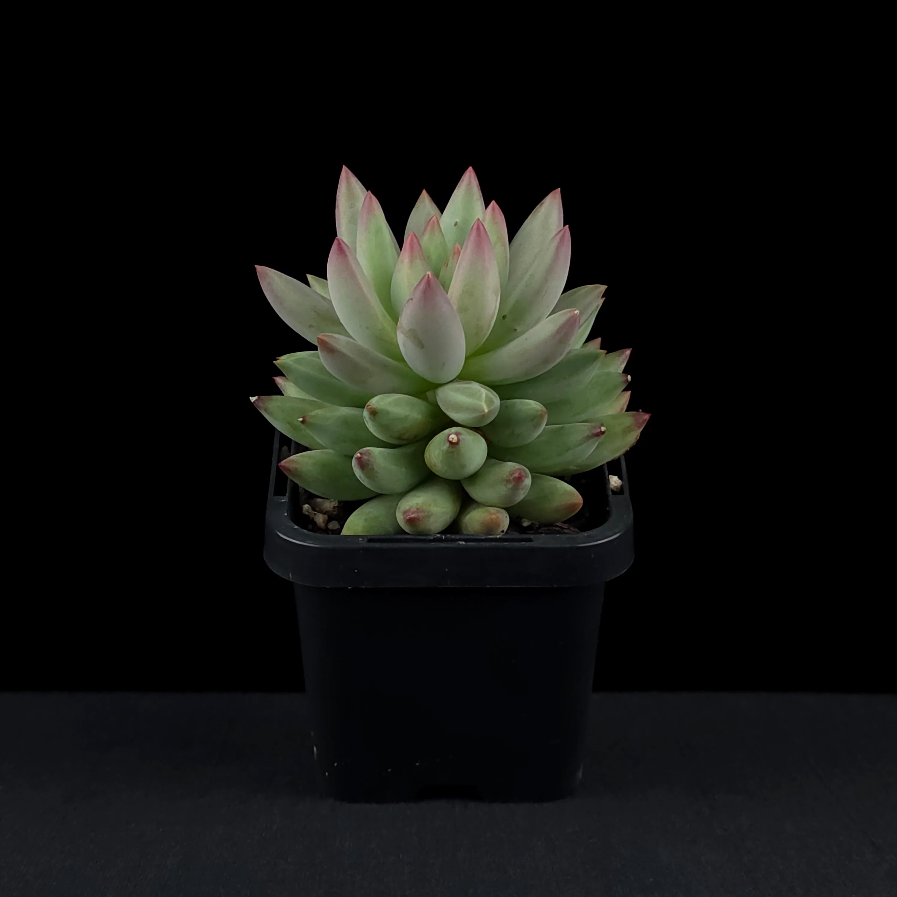 Pachyveria 'Angels Finger' is a hybrid succulent recognised for its elongated, finger-like leaves with a powdery blue-green surface, often flushed with soft pink at the tips when grown in strong light. It forms compact rosettes that can spread slightly as they mature, making it suitable for container edges or shallow bowls. During warmer months, it produces arching flower stalks with orange to pink blooms typical of many Pachyveria hybrids.