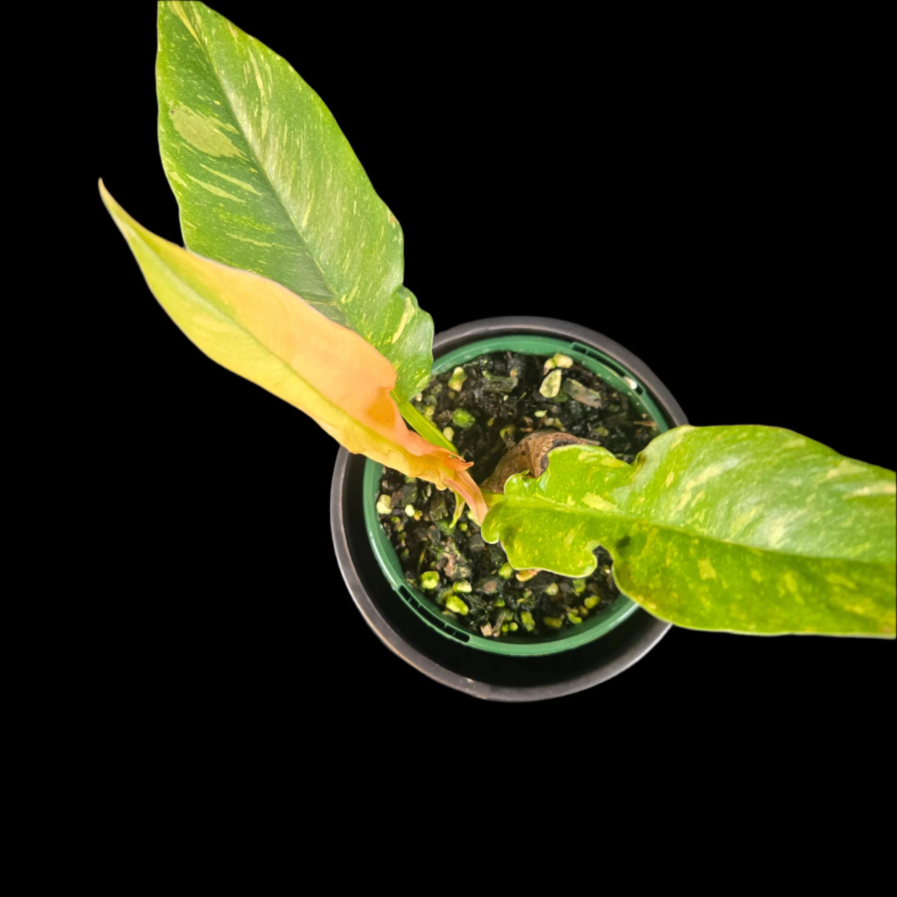 Philodendron 'Ring of Fire' is a hybrid prized for its jagged-edged foliage, deeply variegated with fiery oranges, creams, and lime greens. This specimen descends directly from the original clone imported into Australia, and it is notably superior in both colour saturation and contrast when compared to the more commonly circulated tissue-cultured offspring.